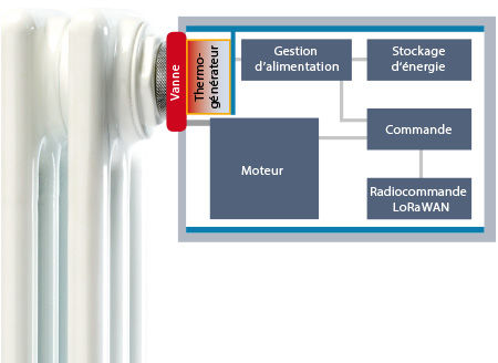 Dotée d’une protection antigel, la vanne produit l’énergie électrique nécessaire à son fonctionnement au moyen d’un générateur thermoélectrique (TEG) intégré.