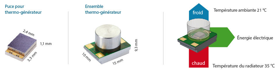 Il contient un thermo-générateur qui convertit une différence de température ambiante en électricité. Ce dernier commence à produire de l’énergie utilisable à partir d’une différence de 4°C.